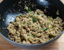 Soffriggete la cipolla e l'aglio inun a padella con tre cucchiai di olio, aggiungete i dadini di melanzana , salate e cuocete per circa 10 minuti , le melanzane dovranno risultare morbide e dorate, un minuto primo di togliere dal fuoco aggiungete la menta tritata.